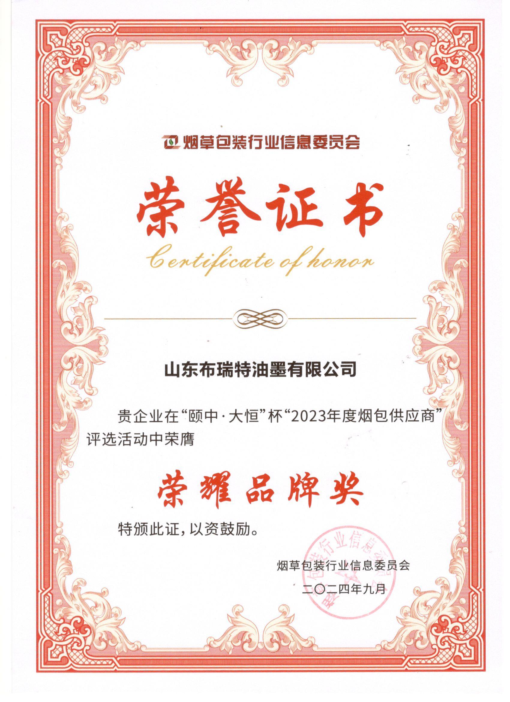 September 2024, Shandong Brett won the “Honorable Brand Award” in the whole category of cigarette package supplier in 2023.